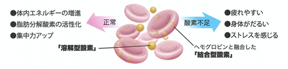 「結合型酸素」とは通常の呼吸で得られる酸素で、血液中のヘモグロビンに依存して融合し、血管に運ばれています。